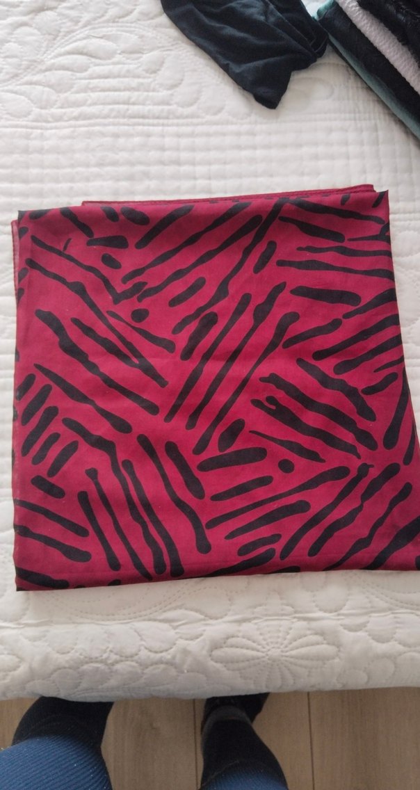 Bordo renkte, siyah soyut desenlerle drapeli tasarıma sahip kadın fular, yumuşak sentetik kumaştan üretilmiştir.