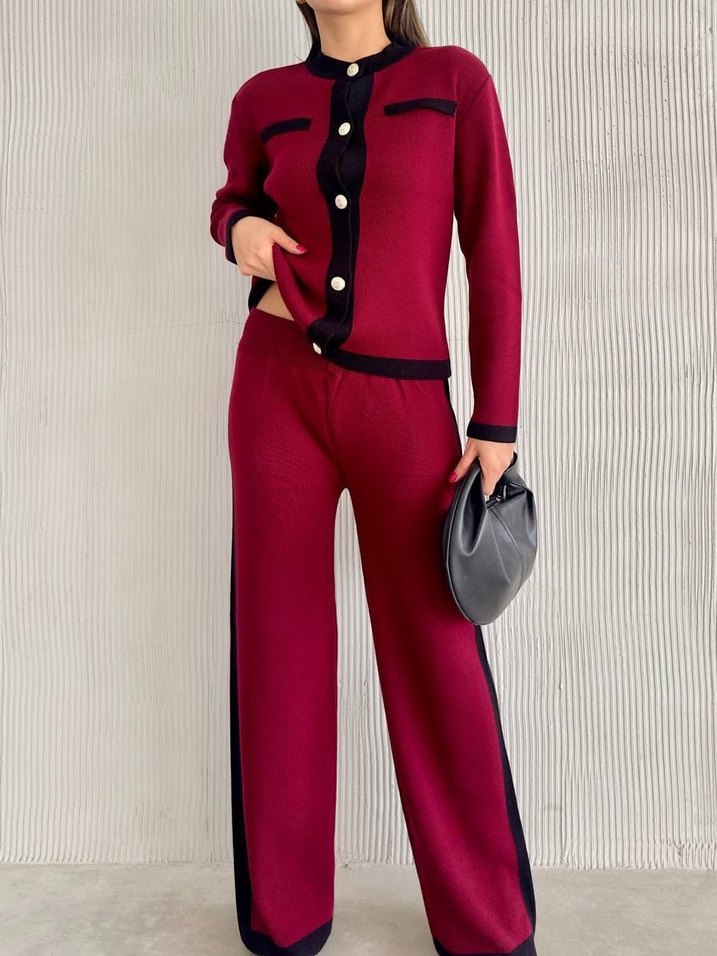 Bordo Siyah Detaylı Düğmeli Kadın Takım