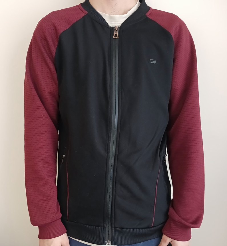 Bordo kollar ve siyah gövdesiyle, fermuarlı, bisiklet yaka ve dar kesime sahip erkek sweatshirt. Günlük kullanım için uygun şık bir sokak tarzı.