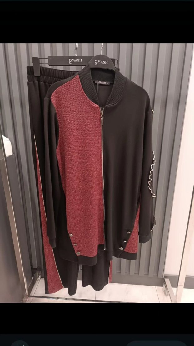 Kadınlar için bordo ve siyah renk bloklu, fermuarlı, uzun kollu ve yuvarlak yakalı geniş kesim eşofman takımı. Günlük kullanım için üst kalite kumaştan yapılmıştır.