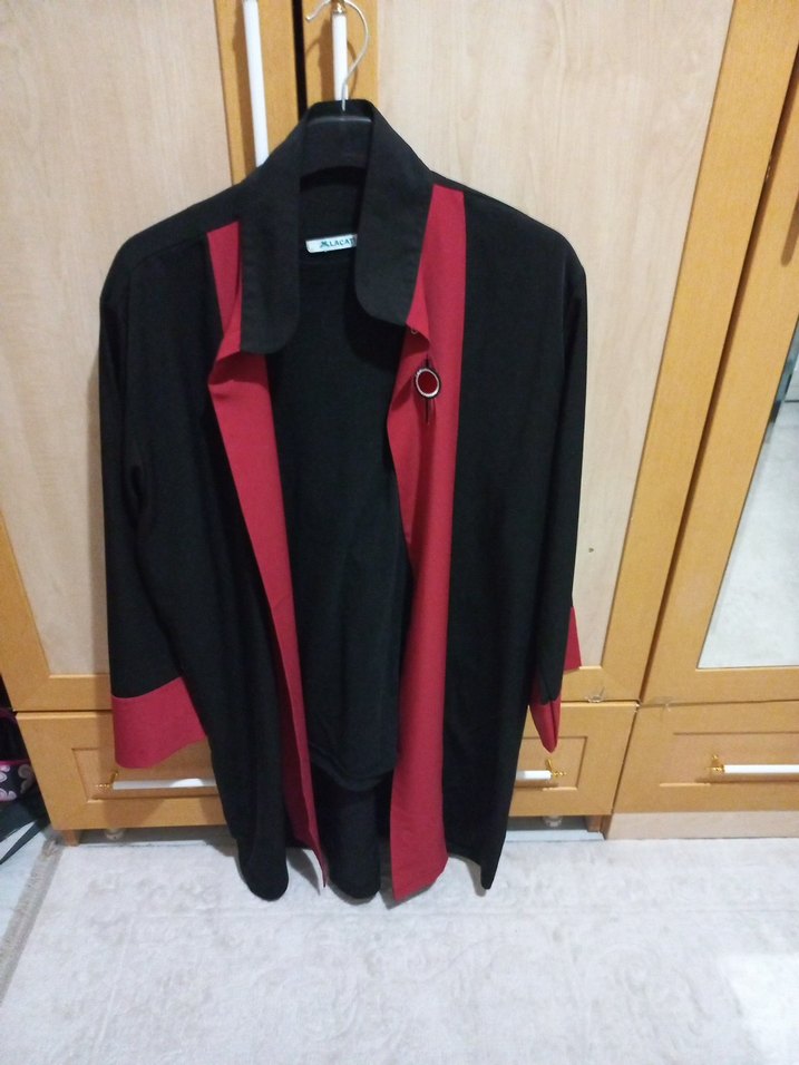 Bordo ve siyah renklerde, düğmeli ön kısmı ve kesik yakası olan uzun, kumaşı harika. Uzun kollu ve yumuşak dokulu, gotik tarzda günlük kullanıma uygun.
