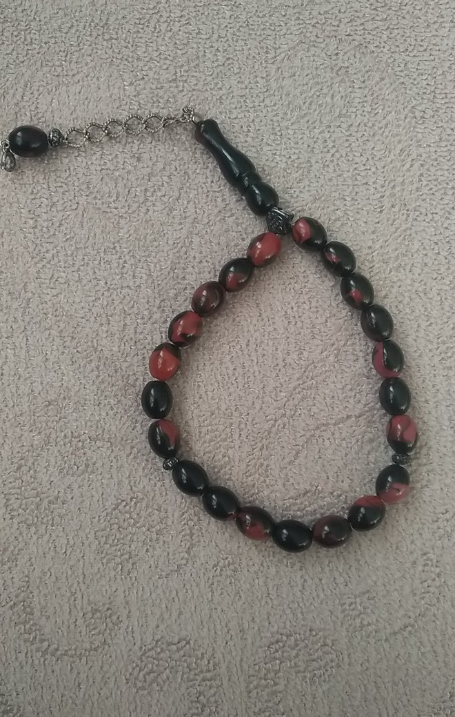 Bordo ve siyah renklerde, gotik tarzda oval şekilli erkek tesbih. Metal zincirle bağlanmıştır. ️