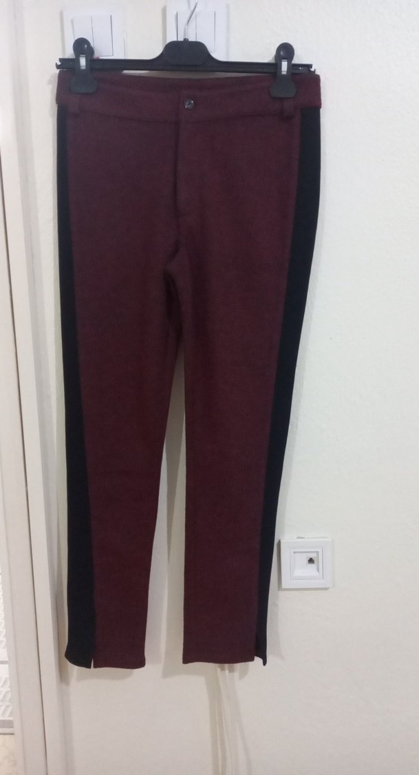 Kadınlar için regular fit, midi boy, yan yırtmaçlı kaşe kumaş pantolon. Bordo ve siyah renklerle sokak stili ve günlük kullanım için uygun.