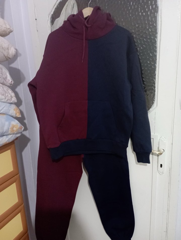 Bordo ve lacivert renklerde, yüksek yakalı ve uzun kollu, rahat kesim kadın eşofman takımı. Yumuşak ve sıcak kumaştan, günlük kullanıma uygun spor tarz.