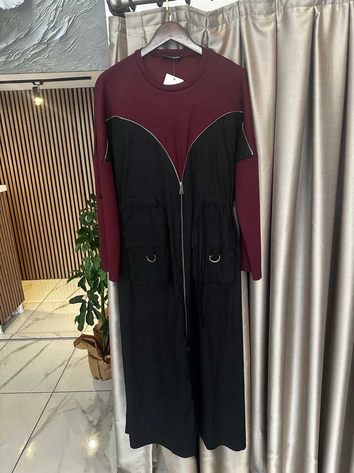 Bordo ve siyah renklerde, fermuarlı uzun kol ve yuvarlak yakalı, bol kesim kadın elbise Günlük rahat sokak stili için uygundur.
