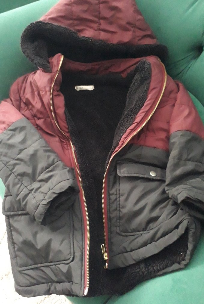 Fermuarlı, kapüşonlu ve kesik yaka detaylı, bordo siyah renkli, yumuşak ve sıcak kumaştan yapılmış, erkek çocuklar için fit kesim mont.