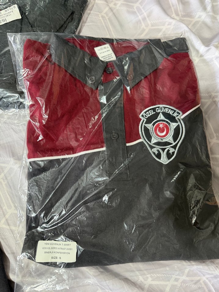 Düğmeli ön kısmı ve yakalı tasarımıyla, bordo ve siyah renklerde, sentetik kumaştan üretilmiş, baskılı özel güvenlik armalı, kısa kollu, dar kesim polo tişört. Uzun kollu sıfır paketli ürün hiç kullanılmadı S beden fakat M / L bedene kadar olur esnek kumaş
