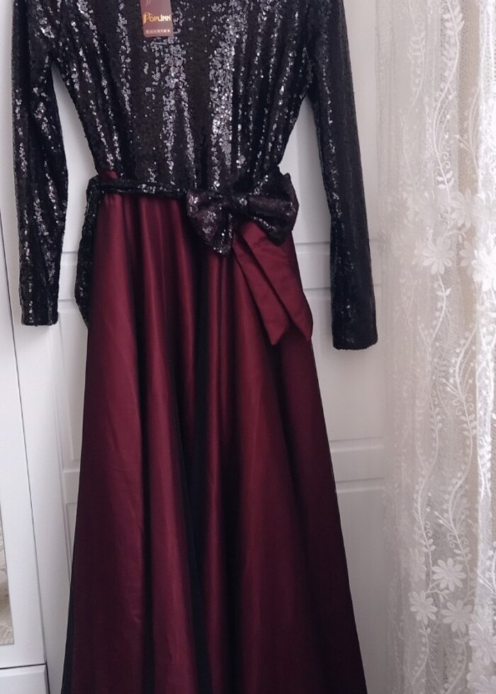 abiye üzeri ve kolları pul işlemeli içerden astarlı olup etek kısmı bordo krep uzerpne siyah tülden olusmaktadir, mezuniyet nişan balo düğün için kullanılabilir. ister tarlatanla ister olduğu kalde kullanabilirsiniz. Eteği arkadan biraz daha uzun olup kuyruklu bir görünümü var ve üst kısmı tam bedene oturan yapıdadır. 40 beden olup 40-42 beden için uyumludur.Abiyeyi kardeşimin düğünü için Modaselvi den almıştım biraz büyük geldi düğün arefesine gelince iade yapamadim. hiç kullanılmadı etiketli üründür.