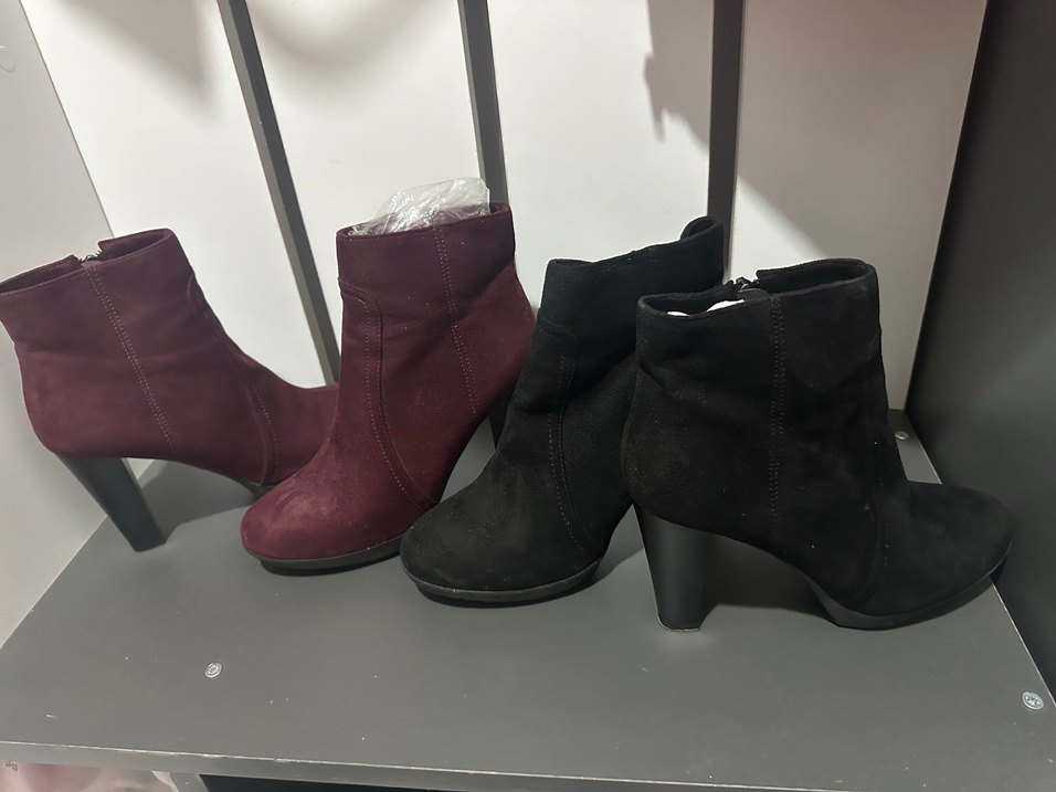 Bordo ve siyah süet malzemeden yapılmış, dolgu topuklu ve fermuarlı kadın botları. Sokak stiline uygun, rahat ve şık tasarım sunar. Siyah 1 kez bordo hiç giyilmemiştir içinde köpükleri altında etiketi hala duruyor ikili fiyat