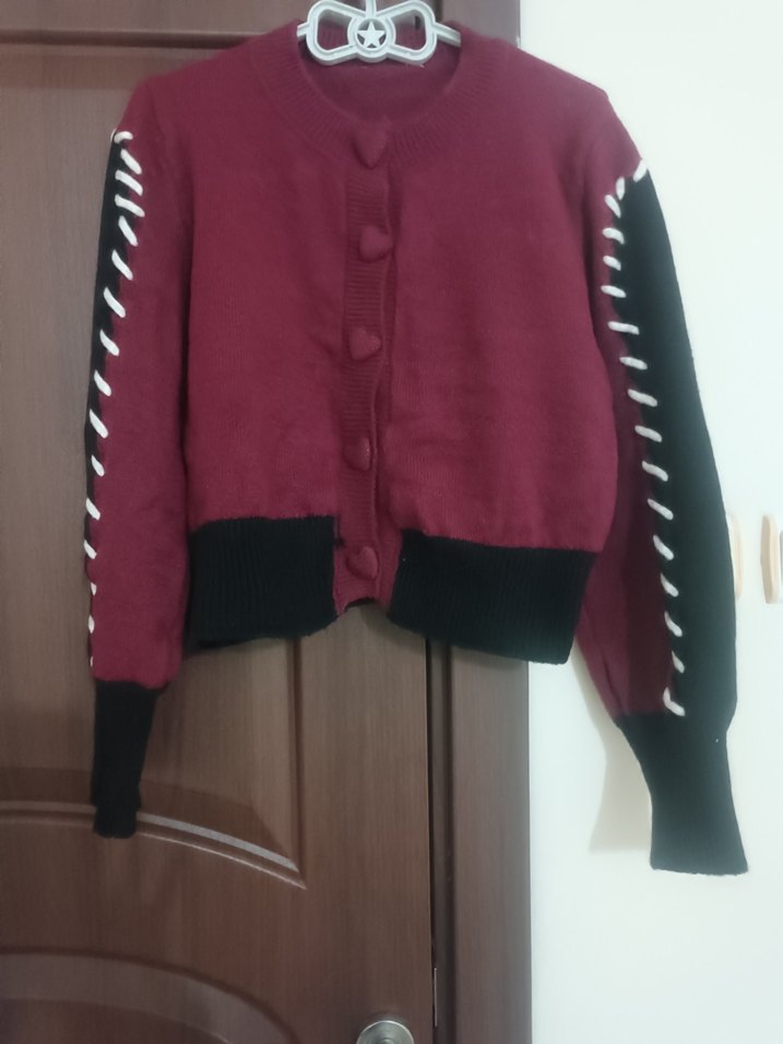 Fitted kesim, uzun kollu, yuvarlak yaka triko kadın hırka. Bordo ana renk, kol ve etekte siyah detaylarla midi uzunlukta, rahat gotik tarzda günlük kullanıma uygun.