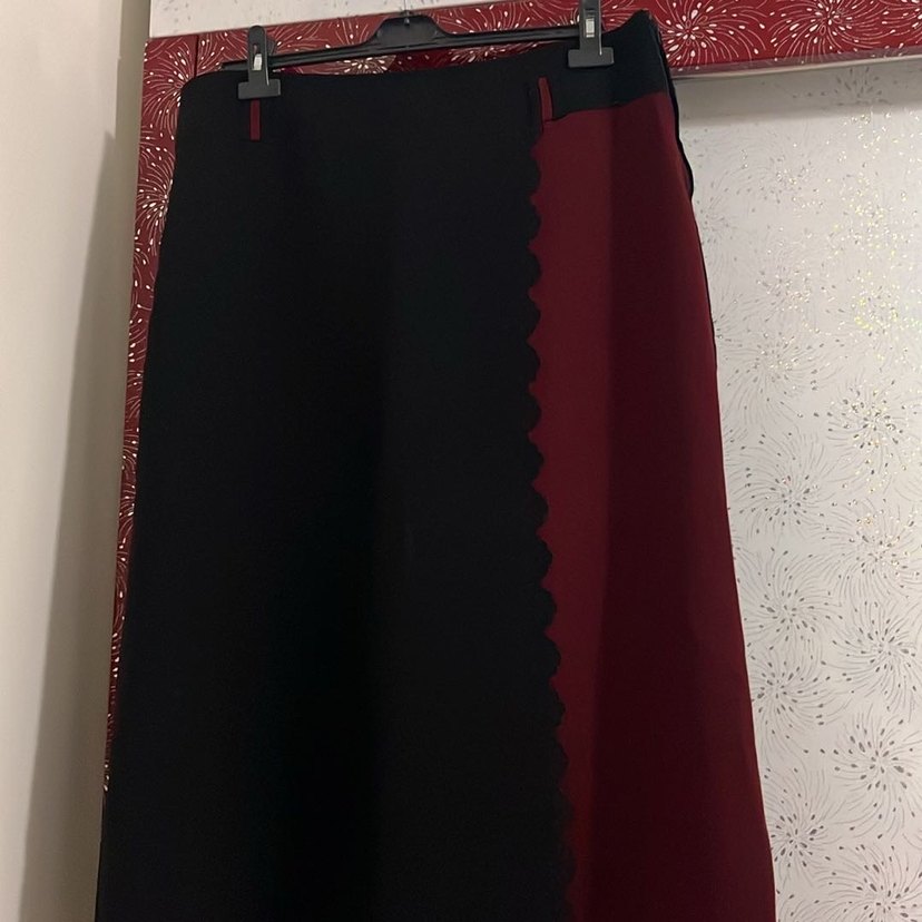 Bordo ve siyah renk bloklu, drapeli uzun kadın eteği. Sentetik kumaştan, düz kesim ve gotik tarzda, ofis için uygun. Bel ölçüsü ve boy ölçüsü görselde mevcuttur.