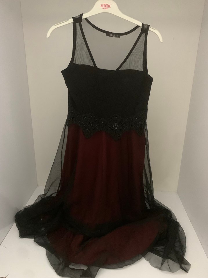 Siyah tül detaylı, bordo astarlı, straplez yaka ve uzun etekli, vücuda oturan gotik abiye elbise. Cesur romantik akşamlar için ideal. Kolarını diktim önü cok açılıyor diye açılabilir etegi uzun oldugu için yere degmeye ait deformeler mevcut