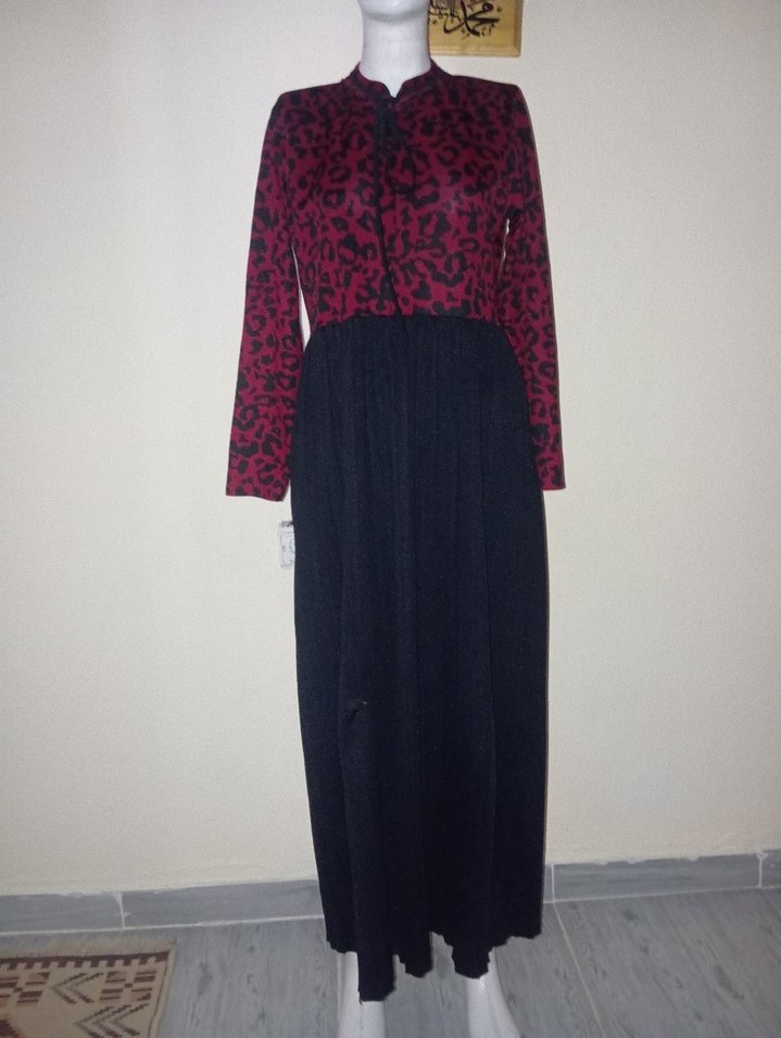 Bordo renkli pileli üst kısmı ve siyah salaş etek kısmıyla uzun kadın elbisesi. Uzun kollu ve yuvarlak yaka, vintage goth tarzı günlük kullanıma uygun.