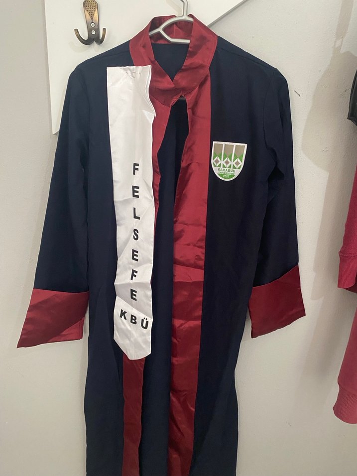 Bordo ve siyah renklerde, düğümlü yaka ve uzun kollu kadın mezuniyet cübbesi. Beyaz "FELSEFE KBU" yazılı kuşaklı, düzenli kesim ve drapeli modeldir.