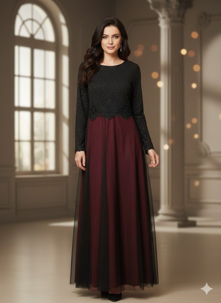 Bordo Siyah Uzun Kollu Abiye Elbise
