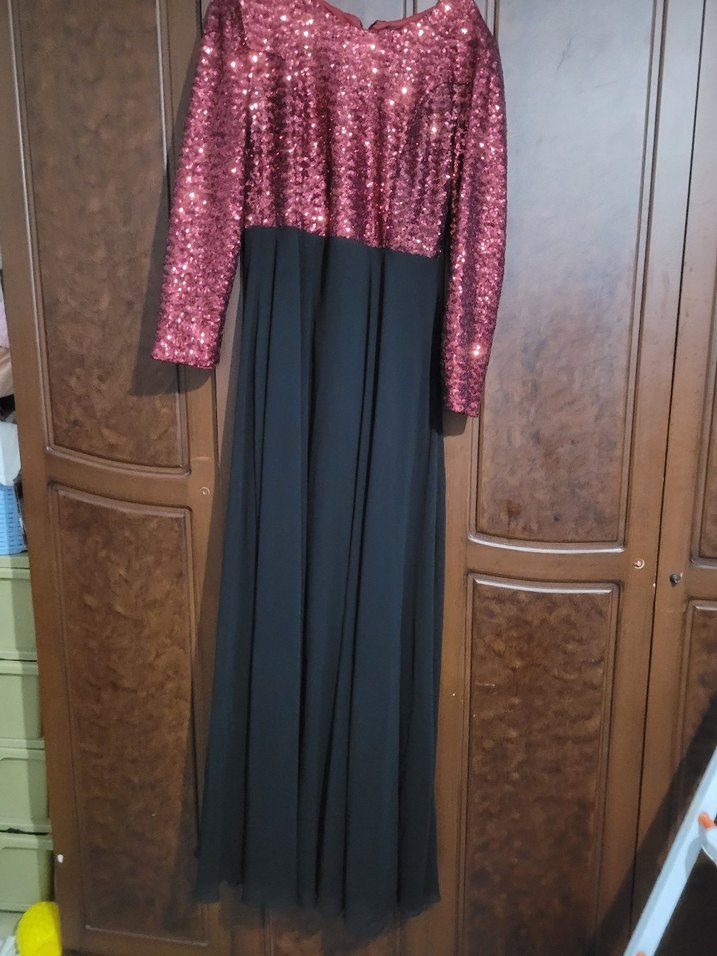 Bordo payetli üst kısmı ve siyah uzun etek kısmı ile uzun kollu, bol kesim kadın abiye elbisedir. Parlak ve şık tasarımıyla parti için uygundur. ✨