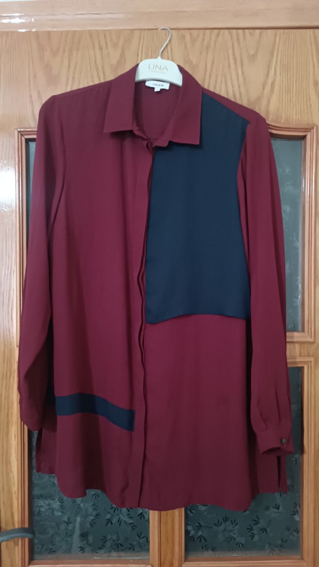 Bordo ve siyah panelli, düğmeli, notlu yakalı, sentetik kumaştan yapılmış, bol kesim uzun kollu midi kadın gömleği. Ofis kullanımı için uygun.