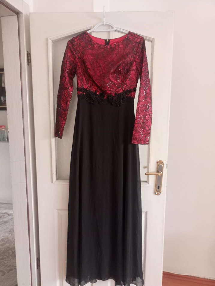 Bordo dantel üst kısmı, uzun kollu ve V yakalı, siyah uzun etekli klasik gotik tarzda vintage elbise. Romantik akşamlar için uygun.elbise hiç giyilmedi sıfırdır