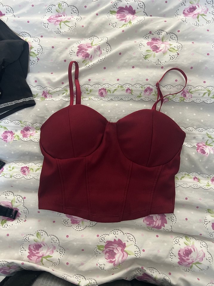 Bordo renkte, ince askılı ve düğmeli, sentetik kumaştan yapılmış, vücuda oturan vintage tarzda bir büstiyerdir.