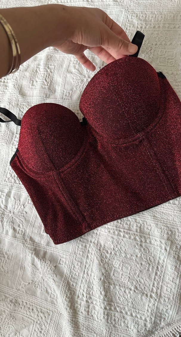 Bordo renkli, straplez yakalı ve arkası ayarlanabilir , vücuda oturan kadın bustiyer. Yumuşak sentetik kumaştan, gotik tarz ve romantik geceler için uygun.