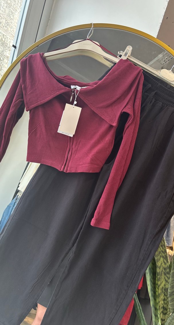 Bordo renkli, uzun kollu, straplez yaka ve ön fermuarlı, sentetik kumaştan kısa kesim kadın kazak. Günlük sokak stiline uygun.