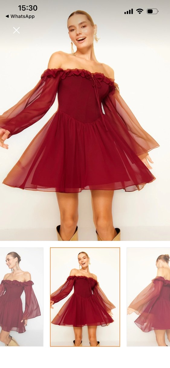 Bordo renkli, straplez ve fırfırlı detaylara sahip bu midi elbise, şeffaf uzun kollu ve ipeksi kumaştan üretilmiştir. Gösterişli ve vücuda oturan kesimiyle romantik akşamlar için ideal.