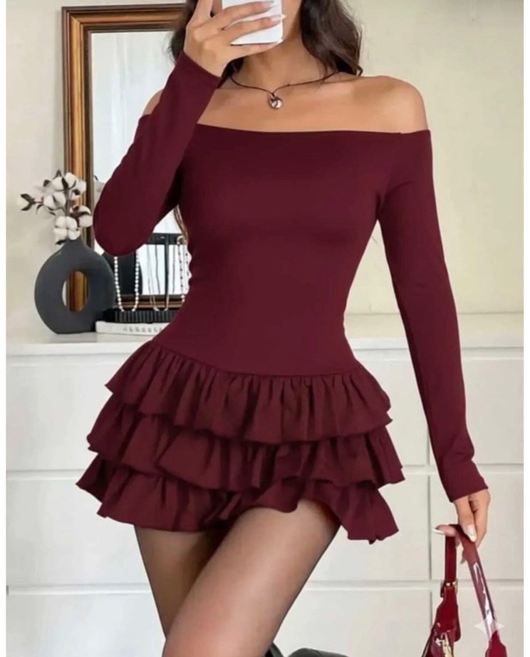 Bordo renkli, straplez yaka ve uzun kollu, fırfırlı katmanlı mini elbise. Çağdaş Paris tarzı, romantik gece için ideal.