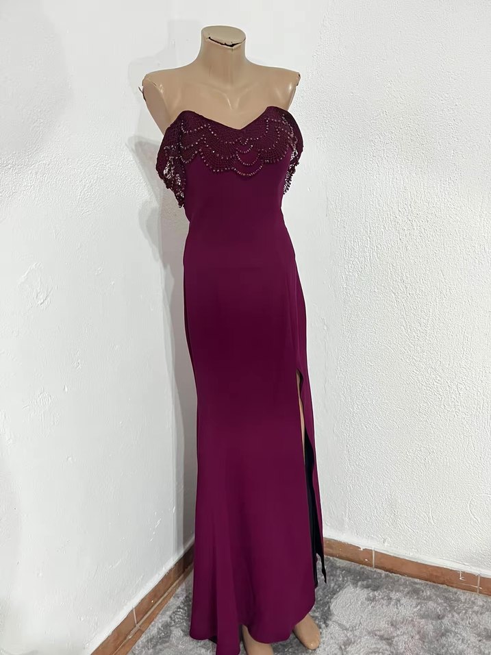 Bordo renkli, straplez yakalı ve drapeli işlemeli uzun abiye elbise. İnce askılı ve vücuda oturan kesimiyle modern klasik tarzda, düğünler için uygun. Beden/1