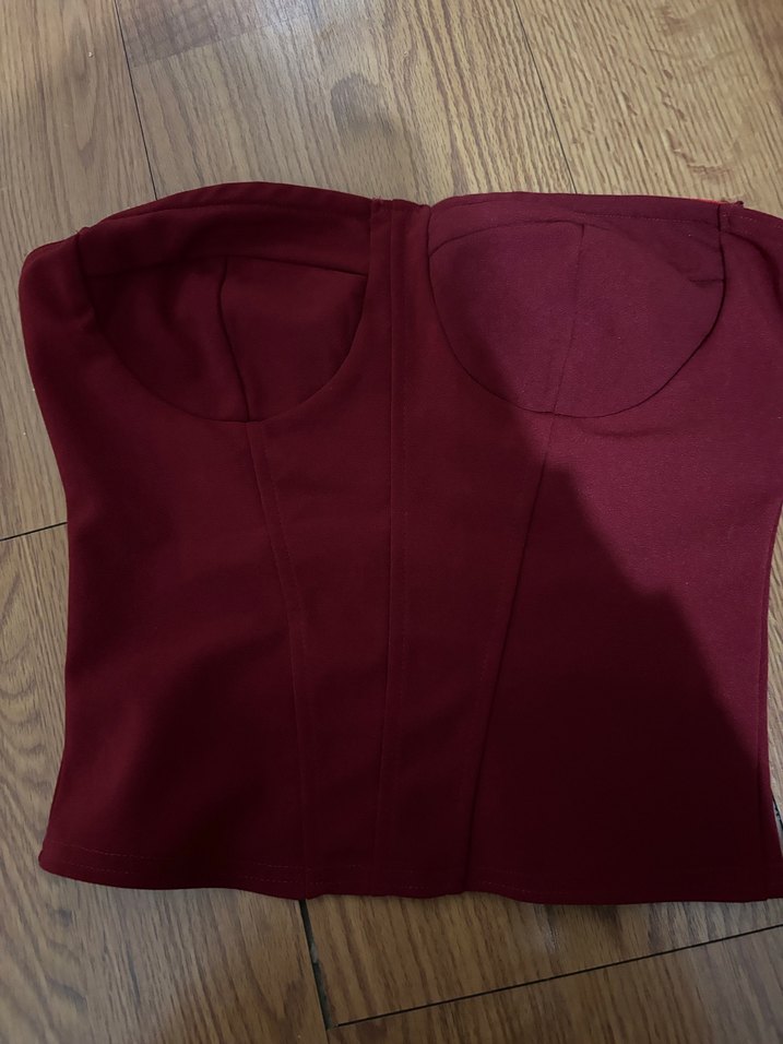 Bordo renkli, straplez ve vücuda oturan bu midi uzunlukta büstiyer, şık ve kolsuz tasarıma sahiptir. Pürüzsüz sentetik kumaştan yapılmış olup, romantik akşamlar için zarif ve sade gotik stil sunar. Trend belirleyiciler için avant-garde bir görünüm sağlar. Hic giyilmedi