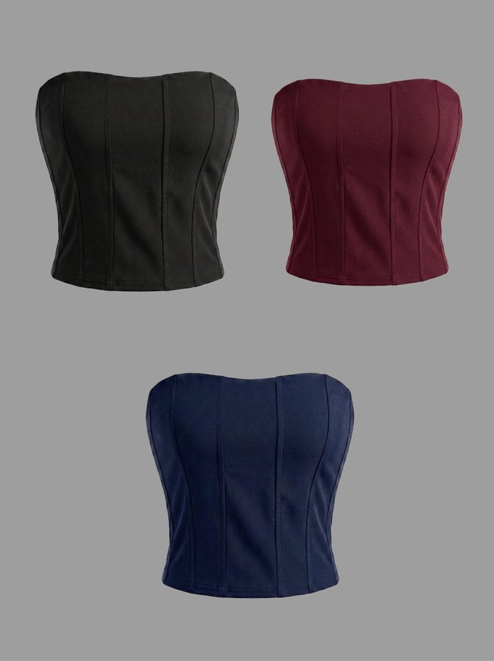 Bordo renkte, straplez ve vücuda oturan bustiyer, sentetik kumaştan minimal ve iddialı bir tarz sunar.