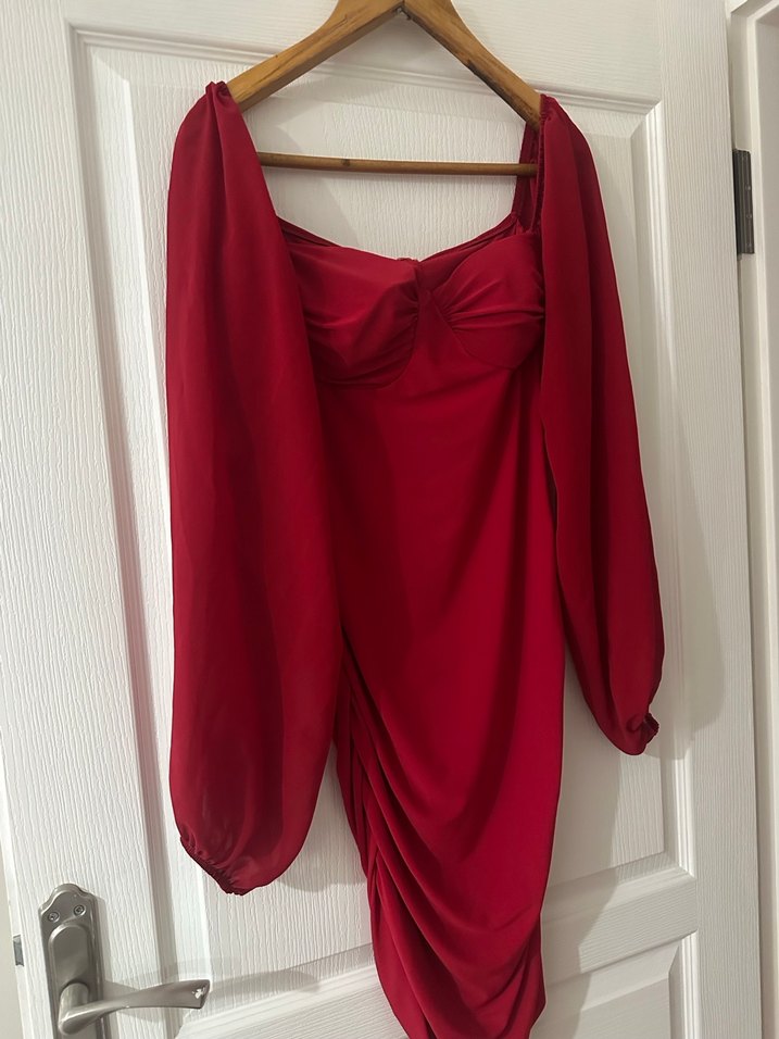 Bordo renk, straplez yakalı ve uzun kollu bu drapeli elbise, bohem tarzıyla romantik akşamlar için ideal bir tercihtir. Vücuda oturan kesimi dikkat çeker.