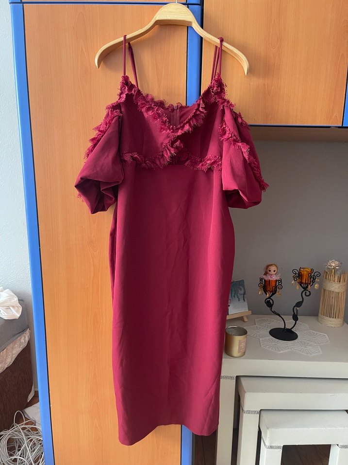 Bordo rengi, straplez ve kolsuz tasarıma sahip, vücuda oturan midi boy elbise. Fırfır detaylarıyla bohem bir şıklık sunar. Romantik akşamlar için ideal.