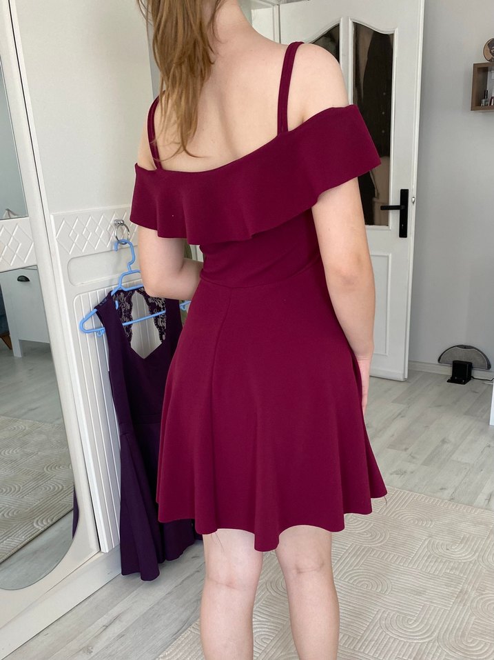 Bordo renkli, fitted kesim ve straplez askılı, volan detaylı midi mezuniyet elbisesi, cesur ve gotik tarzı yansıtır.