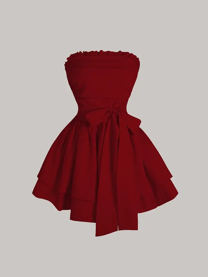 Bordo Straplez Midi Mezuniyet Elbisesi