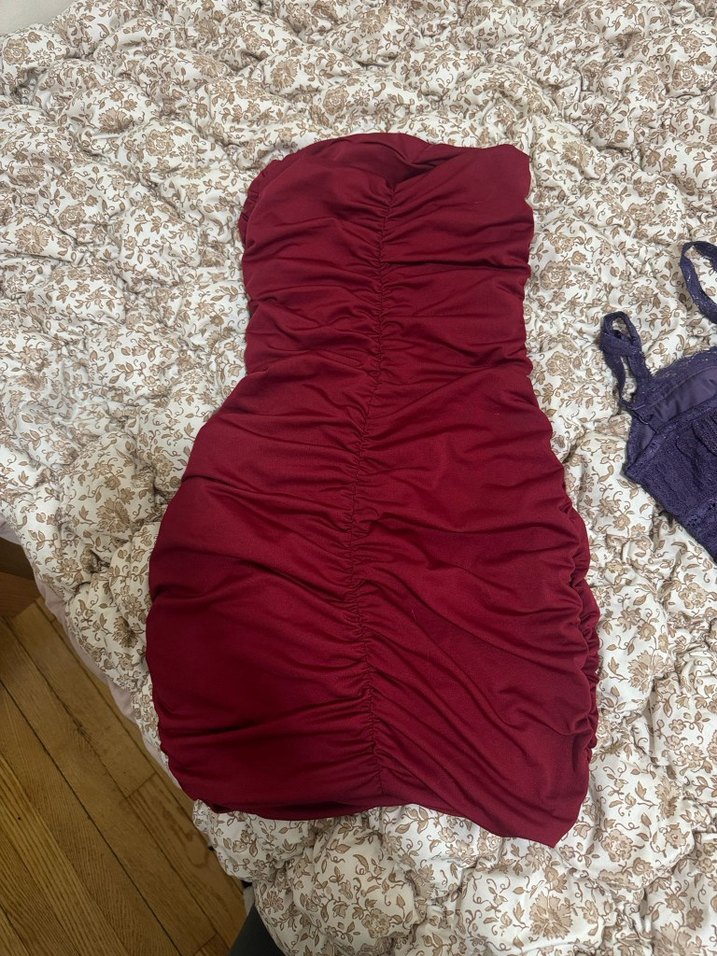 Bordo renkli, straplez yaka ve fırfır detaylı, vücuda oturan mini uzunlukta gece elbisesi. Yurt dışından getirdim.