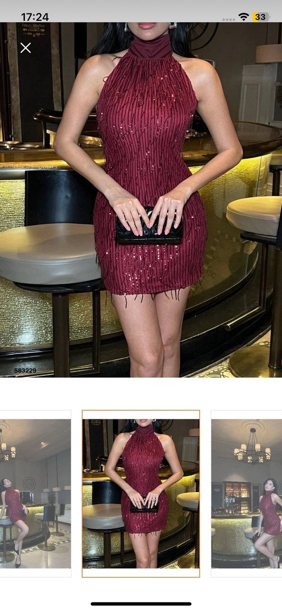 Bordo renk, straplez ve mini uzunlukta, payetli ve nakış detaylı, sentetik kumaştan yapılmış, dar kesim parti elbisesi. Strappy kollara sahiptir.