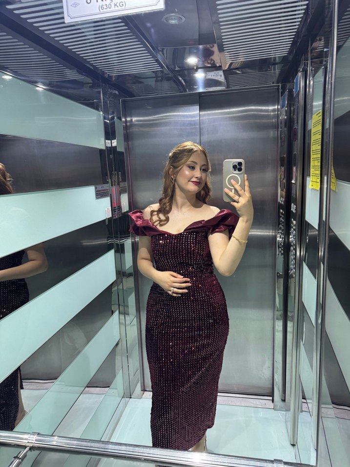 Bordo renkli, straplez ve simli detaylara sahip uzun, vücuda oturan abiye elbise. Parlak yılan deseniyle cesur ve göz alıcı bir görünüm sunar.