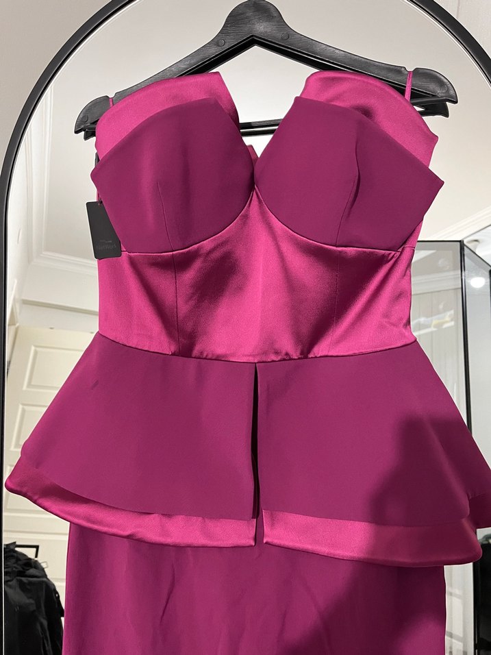 Bordo renkli, straplez ve vücuda oturan uzun abiye elbise, hiç kullanmadım etiketi üzerinde