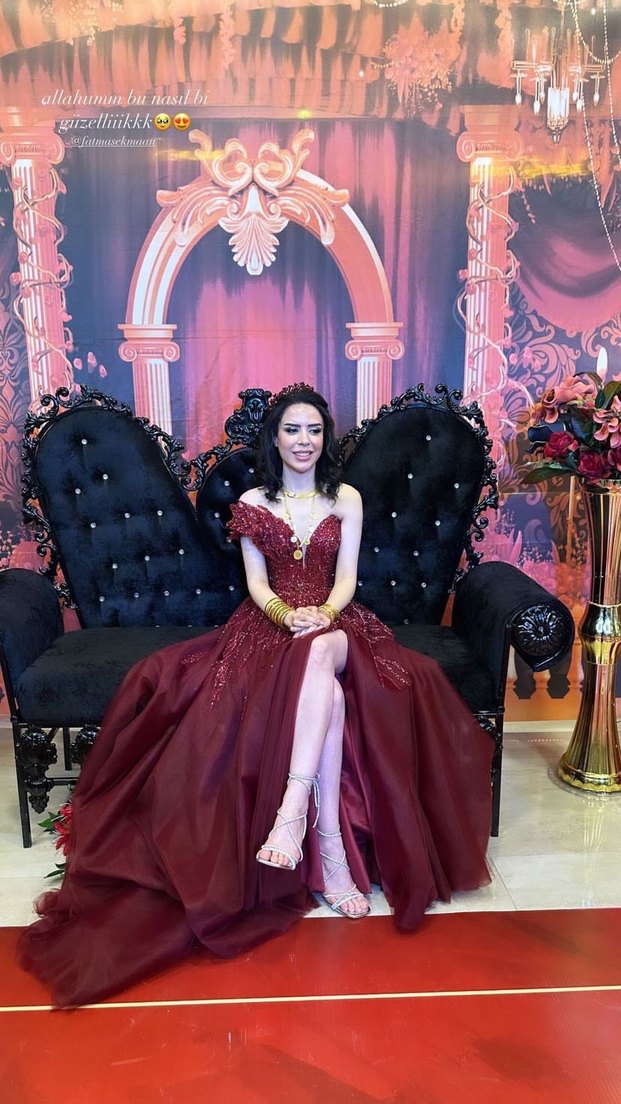 Bordo, straplez yaka, drapeli ve askılı kollu, parlak desenli, vücuda oturan uzun abiye elbise. Kına bordo