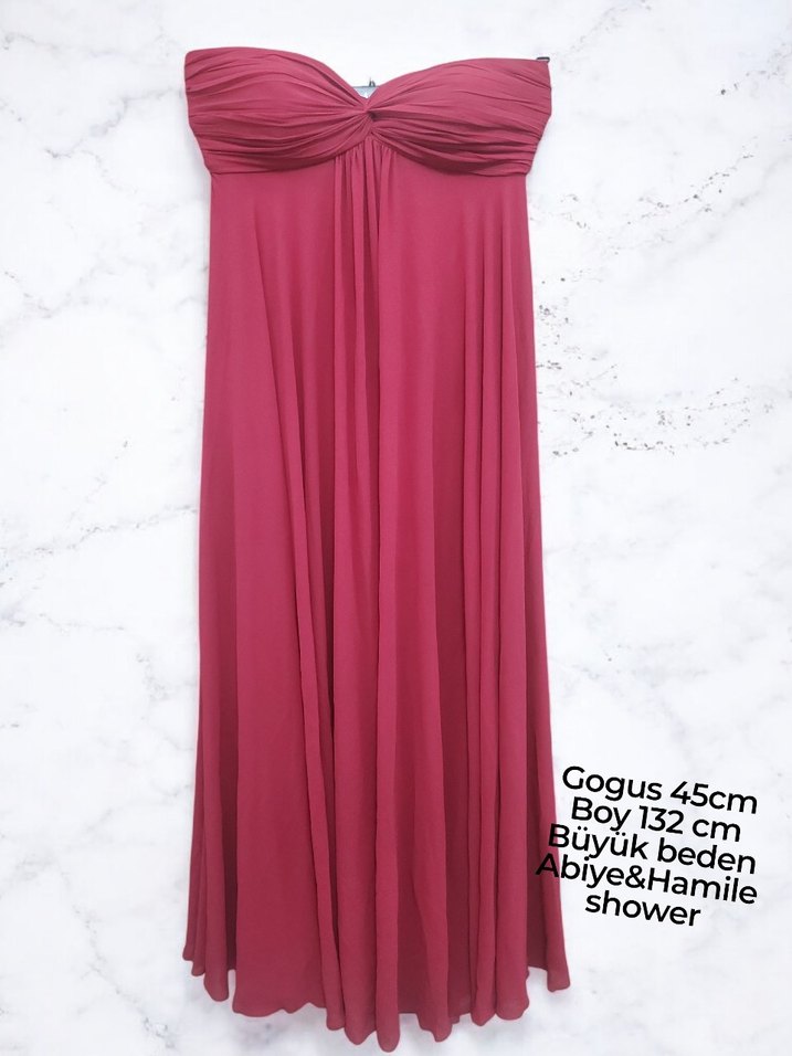 Bordo renkli, straplez, drapeli ve uzun kesim abiye elbise. Koldan kolsuz, belden oturan, bohem tarzda, büyük beden ölçüleri göğüs 45cm, boy 132cm. SO LADY marka