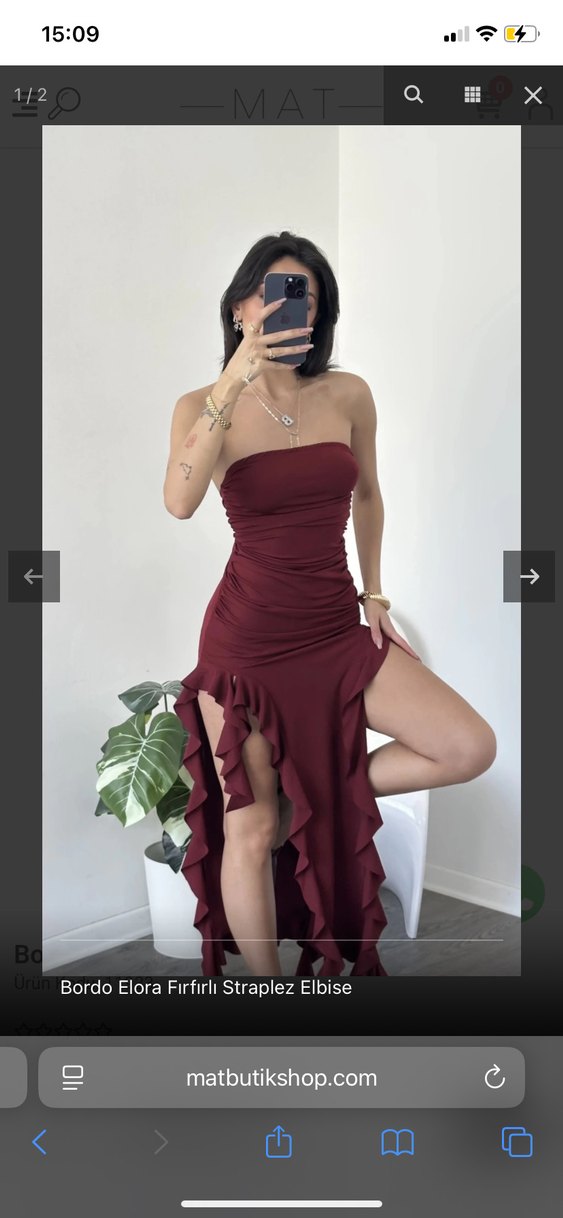 Bordo renkli, straplez uzun elbise, drapeli ve firfir detaylı, ipeksi kumaştan, romantik akşamlar için uygun.