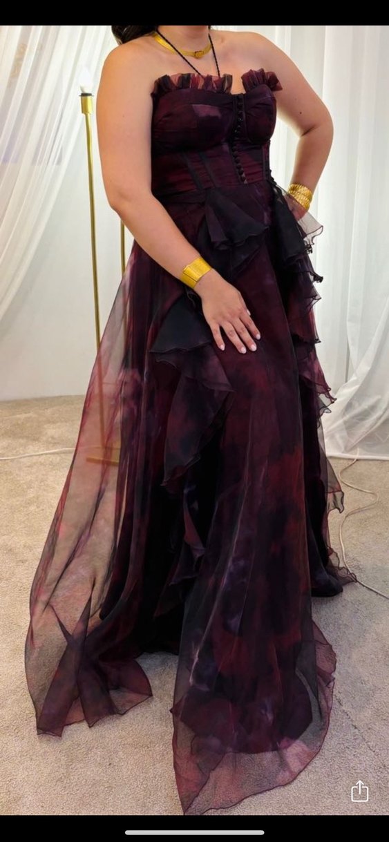 Bordo, straplez ve kolsuz uzun abiye elbise, drapeli ve tie-dye desenlidir. Gotik tarzıyla düğünler için uygundur.
