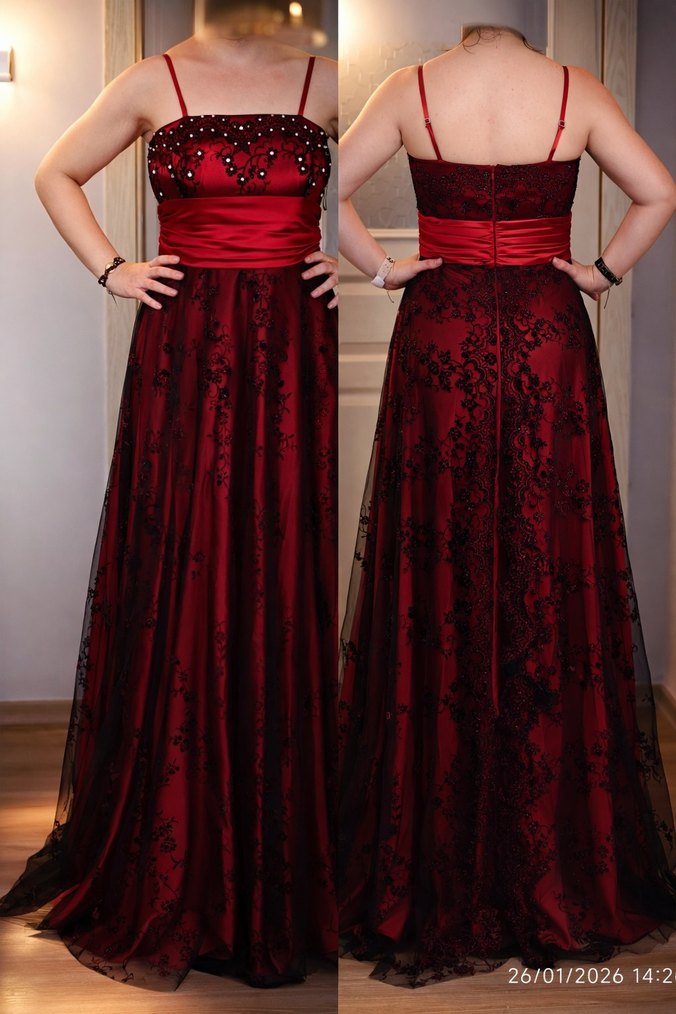 Bordo straplez, ince askılı, uzun ve drapeli gotik desenli abiye elbise. Klasik şıklık ve düğün için uygun.