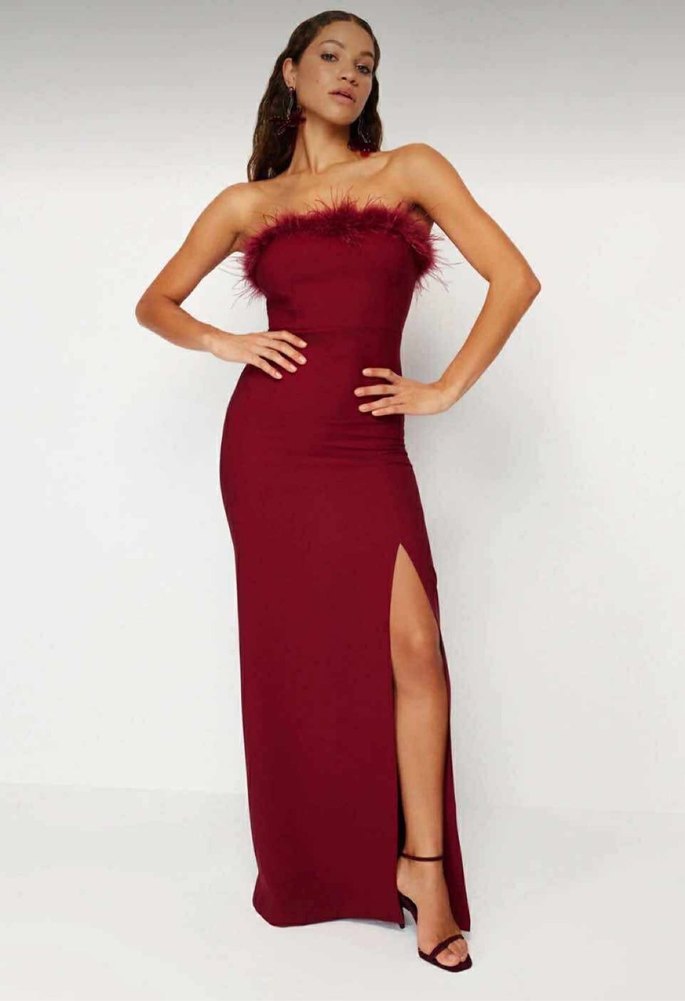 Bordo renkli, straplez yaka ve kürk detaylı, uzun ve vücuda oturan elbise. Yumuşak sentetik kumaştan, romantik akşamlar için ideal.