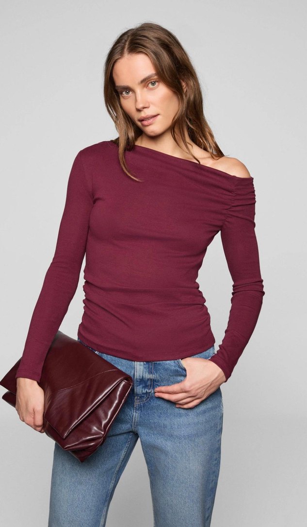 Bordo süet kumaştan, straplez yaka ve uzun kollu, vücuda oturan kadın bluz. Günlük kullanıma uygun, rahat ve şık bir tasarım.