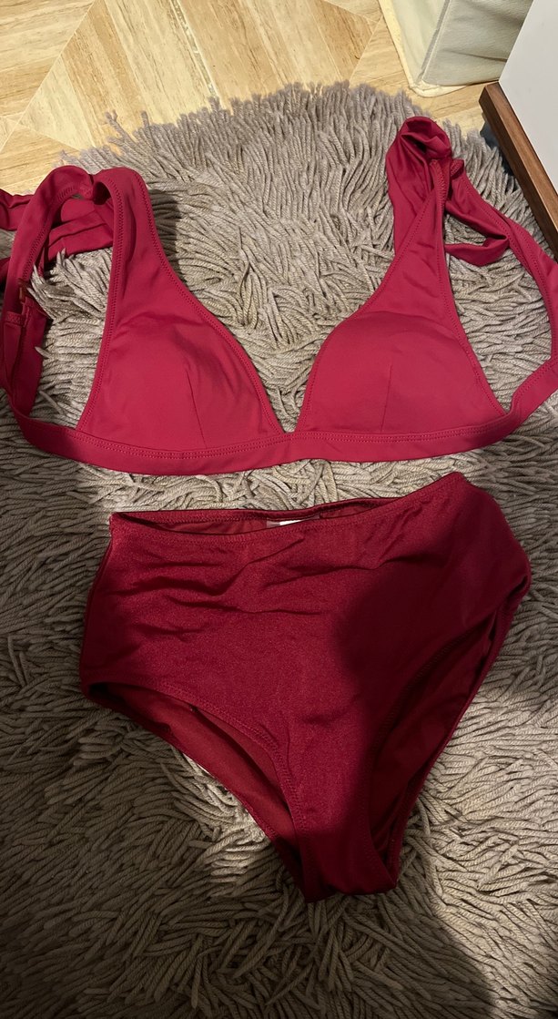 Bordo, strappy detaylı, vücuda oturan bikini takımı. Düz ve koyu renkli kumaşıyla plajda rahat ve şık bir görünüm sunar.