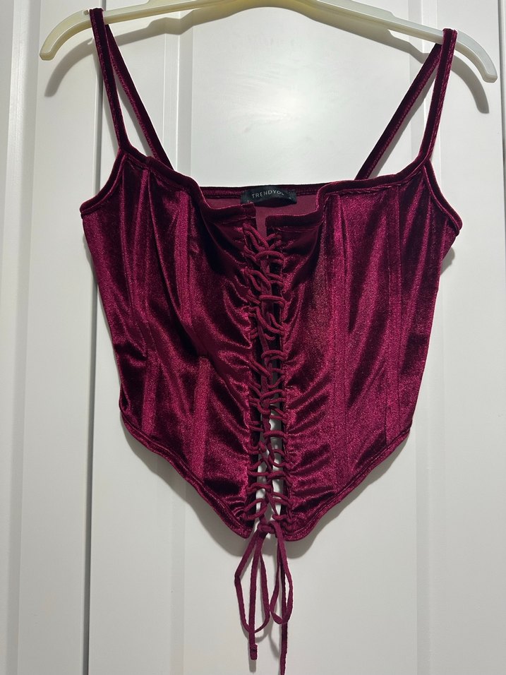 Bordo renkli, ince askılı ve ön kısmı bağcıklı drapeli, vücuda oturan gotik tarzda bir büstiyerdir.