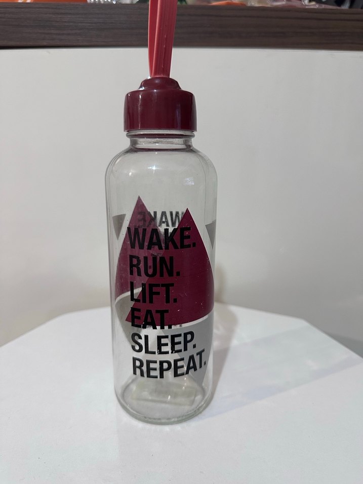 Bordo renkli, üzerinde motivasyonel yazılar bulunan, vidalı kapaklı taşınabilir su şişesidir.