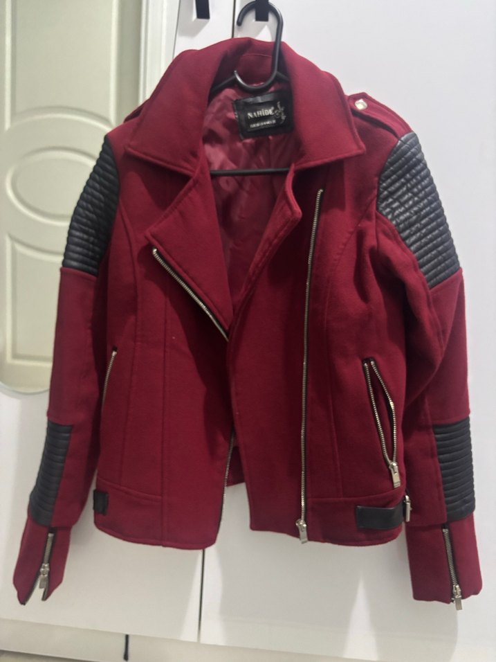 Bordo süet biker ceket, fitted kesim ve fermuar detaylarına sahiptir. Uzun kollu, siyah kapitone detaylı, midi boyda ve günlük kullanıma uygundur.