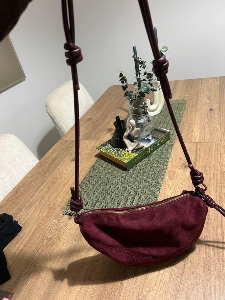Bordo süetten yapılmış, kemerli ve ayarlanabilir askılı bohem tarzda kadın çantası. Desensiz yüzeyi ve koyu renk tonu günlük kullanıma uygundur.